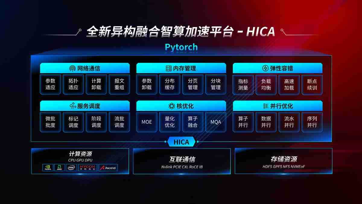 通过自研的服务层、、、中间适配层、、、以及调度编排算法,,,,采用数据并行、、、模型并行等多种并行方式,,,,把并行计算任务进行有效的分解,,,使其分别由相应的软件栈和算力资源来承接。。。当GPU资源变化,,,,HICA可以实时动态调度计算子任务并调整模型拓扑和架构,,,以充分聚合各种算力资源。。。。